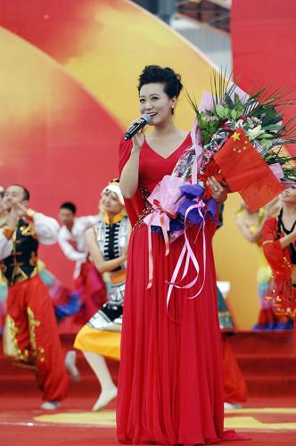 8月7日,歌唱家谭晶在为工人们演唱。当日,为了庆祝全国锰业技术研讨会的成功举行,一台载歌载舞的文艺演出在宁夏中宁县天元锰业公司的厂区车间内举行,国内多位知名艺术家登台献艺。新华社记者 彭昭之 摄