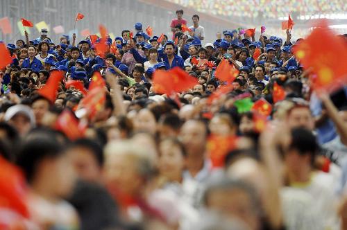 8月7日,工人们在为精彩的节目喝彩。当日,为了庆祝全国锰业技术研讨会的成功举行,一台载歌载舞的文艺演出在宁夏中宁县天元锰业公司的厂区车间内举行,国内多位知名艺术家登台献艺。新华社记者 彭昭之 摄