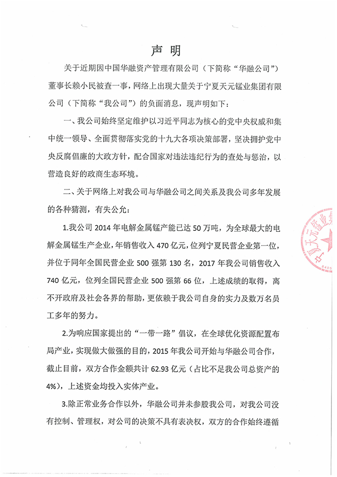关于近期因中国华融资产管理有限公司(下简称“华融公司”)董事长赖小民被查一事,网络上出现大量关于宁夏天元锰业集团有限公司(下简称“我公司”)的负面消息,现声明如下: