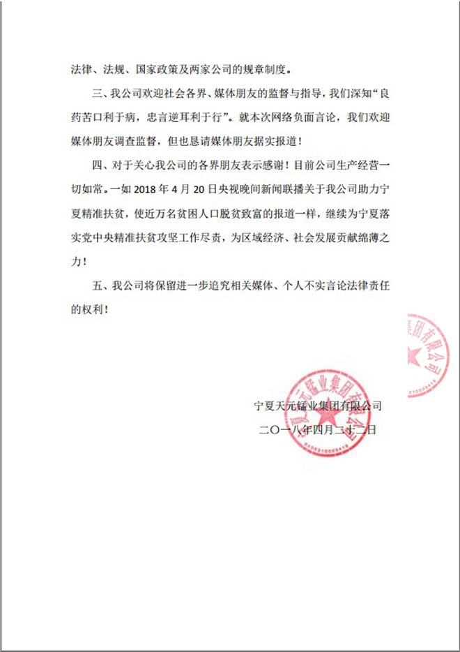 四、对于关心我公司的各界朋友表示感谢!目前公司生产经营一切如常。一如2018年4月20日央视晚间新闻联播关于我公司助力宁夏精准扶贫,使近万名贫困人口脱贫致富的报道一样,继续为宁夏落实党中央精准脱贫攻坚工作尽责,为区域经济、社会发展贡献绵薄之力!