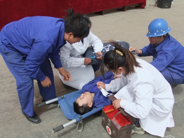 下午3点整,消防应急演练正式开始,模拟锰厂电解七车间清槽工在清完槽后,因操作失误将阴极板插反,造成槽面起火引发火灾,火势蔓延引燃车间准备换用的隔膜框及隔膜袋,火灾现场有2名员工被困,电解车间清槽工立即报告当值班长,并逐级汇报到锰厂总经理处,总经理接到汇报后立即赶赴现场查看火势情况,并下令启动公司火灾事故应急救援预案,展开灭火救灾救困行动,救援队到达后按规定的疏散线路疏散并清点人数,确定被困人员;警戒组沿事故车间周围拉设警戒线,以免造成更大的损失;抢险灭火组迅速进入火灾现场扑救火灾,并抢救被困人员;伤员被救治后交医疗救护组,检查伤情,进行初步救治,然后及时将伤情汇报总指挥,决定是否送往医院救治……整个过程井然有序。
