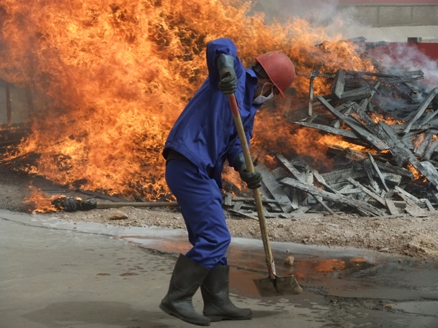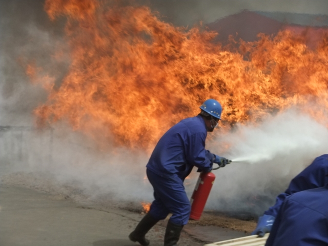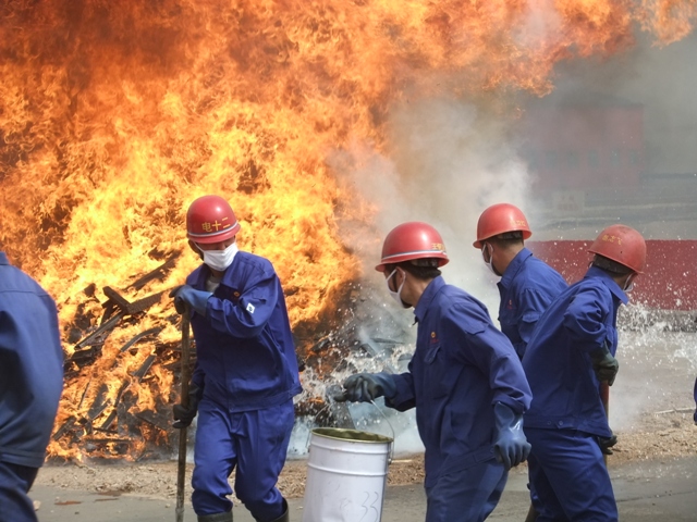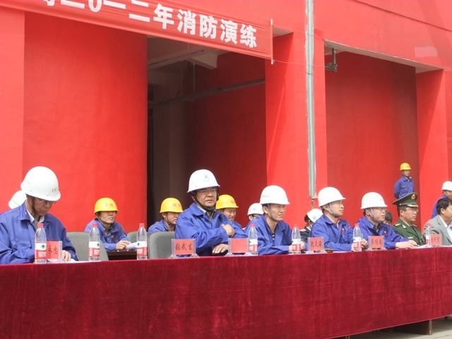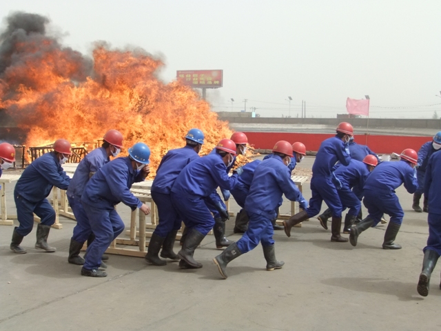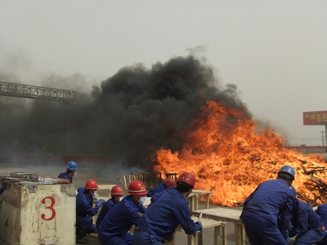 模拟火灾现场火势凶猛,加上恶劣的风沙天气,给火灾消防演练带来一定困难,但是在李建忠总经理有条不紊的指挥下,在所有演练人员的配合下,演练圆满结束。