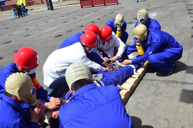 上午10点30分,消防、高空坠落应急演练正式开始。演练模拟锰一厂球磨车间5#料仓顶设备出现故障,车间安排两名维修工前去检查维修。两名维修工接到维修任务后登上料仓6米平台进行设备维修,在使用电焊机进行作业时,由于焊渣掉落,引起地面的易燃物着火造成火灾,现场安全监护员立即用灭火器进行灭火;两名维修工看到着火后,立即从维修平台撤离,在撤离过程中由于火灾烟雾造成视线不清,导致两人从高处坠落。现场安全监护员立即向车间值班主任报告,并逐级汇报到总经理处,总经理接到电话后下令立即启动宁夏天元锰业有限公司消防、高处坠落事故应急救援预案,并及时展开灭火救援行动。各救援小组到达后立即投入救援:引导疏散组及时将人员疏散到安全地带;安全警戒组维护事故现场秩序,拉设警戒线进行交通管制;抢险救援组迅速进入火灾现场扑救火灾,抢救被困人员,并将受伤人员抬离到安全地点;医疗救护组快速解救伤员,并将伤员转运至安全地带进行简单救治并及时拨打120,待120急救车到达后,将受伤人员抬上120急救车进行救治……整个救援过程紧张而有序。